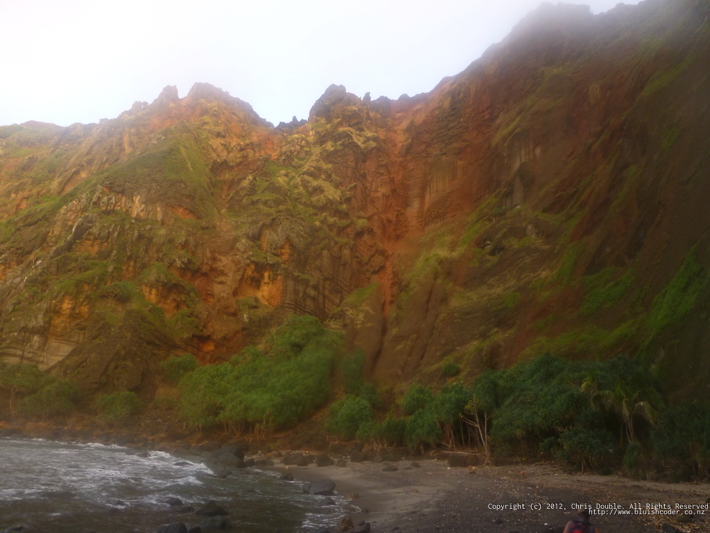 The sun was rising giving a nice morning sky as we were on our way to the Down Rope track via quad bike. In the pictures below you can see the steps leading down at the top of the path. Further down shows the view looking down onto the beach where Down Rope leads. That's Shawn, the Pitcairn guide, who led me down. Without him I'd never have found the path. The beach you can see from that view is the one in this image.