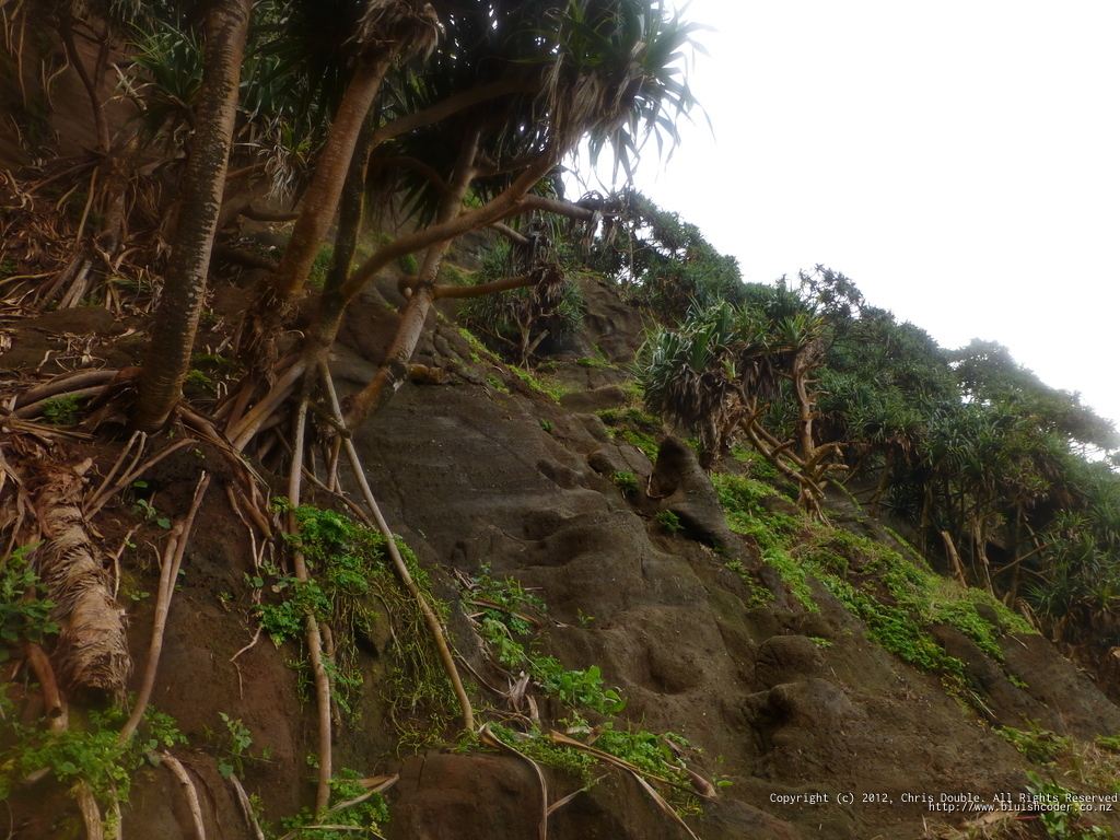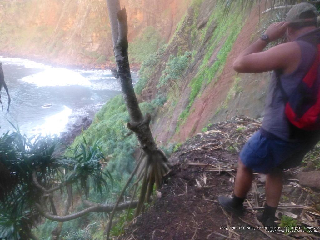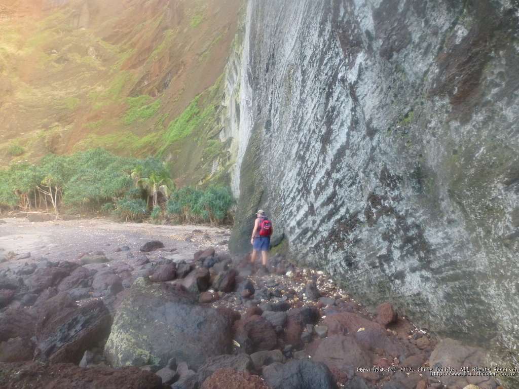 The night before my last day on Pitcairn Island I was asked what areas of the island I hadn't seen that I'd like to before I left. I mentioned "Down Rope" where the petroglyphs can be seen. The petroglyphs are markings at the base of a rockface at an enclosed beach. The markings are thought to be made by pre-european polynesians. To get to there you have to go down a steep path cut into the side of the rock. Parts of it are only about a foot wide and it's a long way down. The yacht taking me back to Mangareva was scheduled to leave at 9am the next day so I didn't think they'd be much chance of seeing it. Shawn, one of the Islanders, offered to take me down at 7am if I was keen and I agreed.